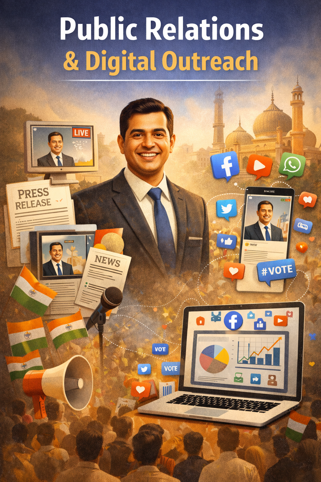 At Political Management, our Public Relations & Digital Outreach services are designed to shape strong public perception, enhance candidate visibility, and build sustained trust with voters across traditional and digital platforms. We help political leaders communicate their vision clearly, consistently, and credibly in an increasingly fast-moving media environment.
