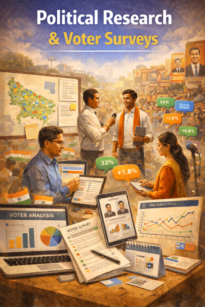 Our strategy is built through detailed political research, voter surveys, data analysis, and ground-level insights. We combine local intelligence with modern campaign tools to create a clear, actionable roadmap for each campaign.