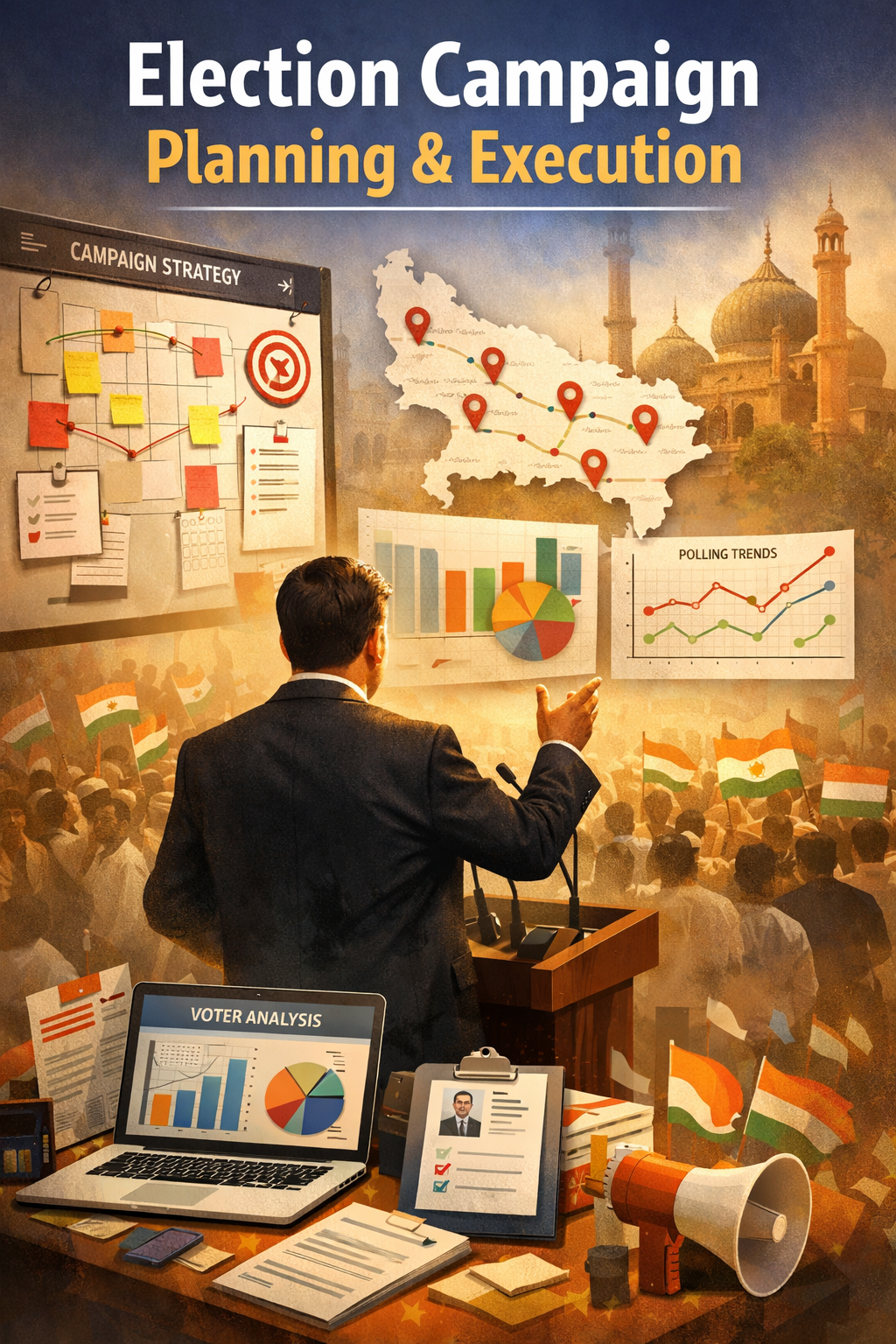 At Political Management, we provide comprehensive Election Campaign Planning & Execution services designed to build strong, disciplined, and results-oriented political campaigns. Our approach begins with a deep understanding of the political landscape, constituency dynamics, voter behavior, and candidate positioning to create a clear and achievable campaign roadmap.